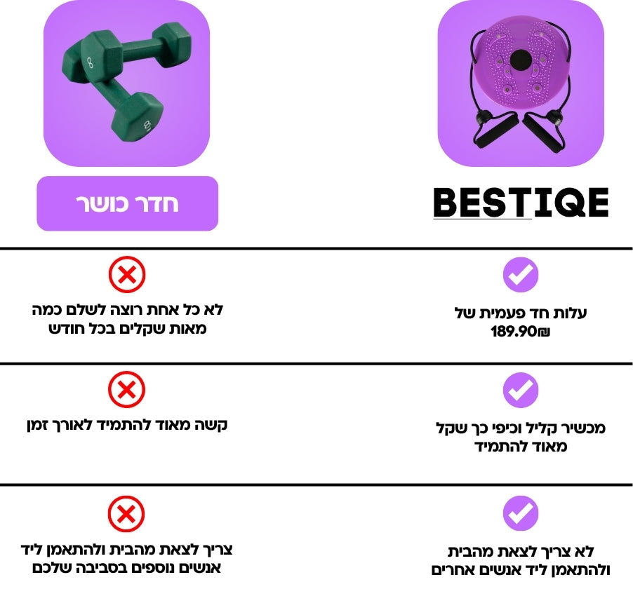 לאחר חשיבה רבה ובדיקות מעמיקות, יצרנו את מכשיר החיטוב בשבילכן. הוא נועד להעניק לכם אימונים כיפיים ואיכותיים ולהעניק לכן תוצאות מרשימות וביטחון עצמי גבוה.